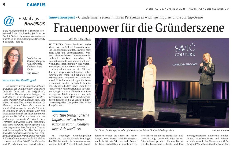 Der Hauptartikel thematisiert "Female Entrepreneurship", denn Gründerinnen setzen mit ihren Perspektiven wichtige Impulse in der Startup-Szene. Das Center for Entrepreneurship fördert die jungen Unternehmerinnen mit gezielten Angeboten und schafft ein offenes Umfeld für einen inspirierenden Austausch.