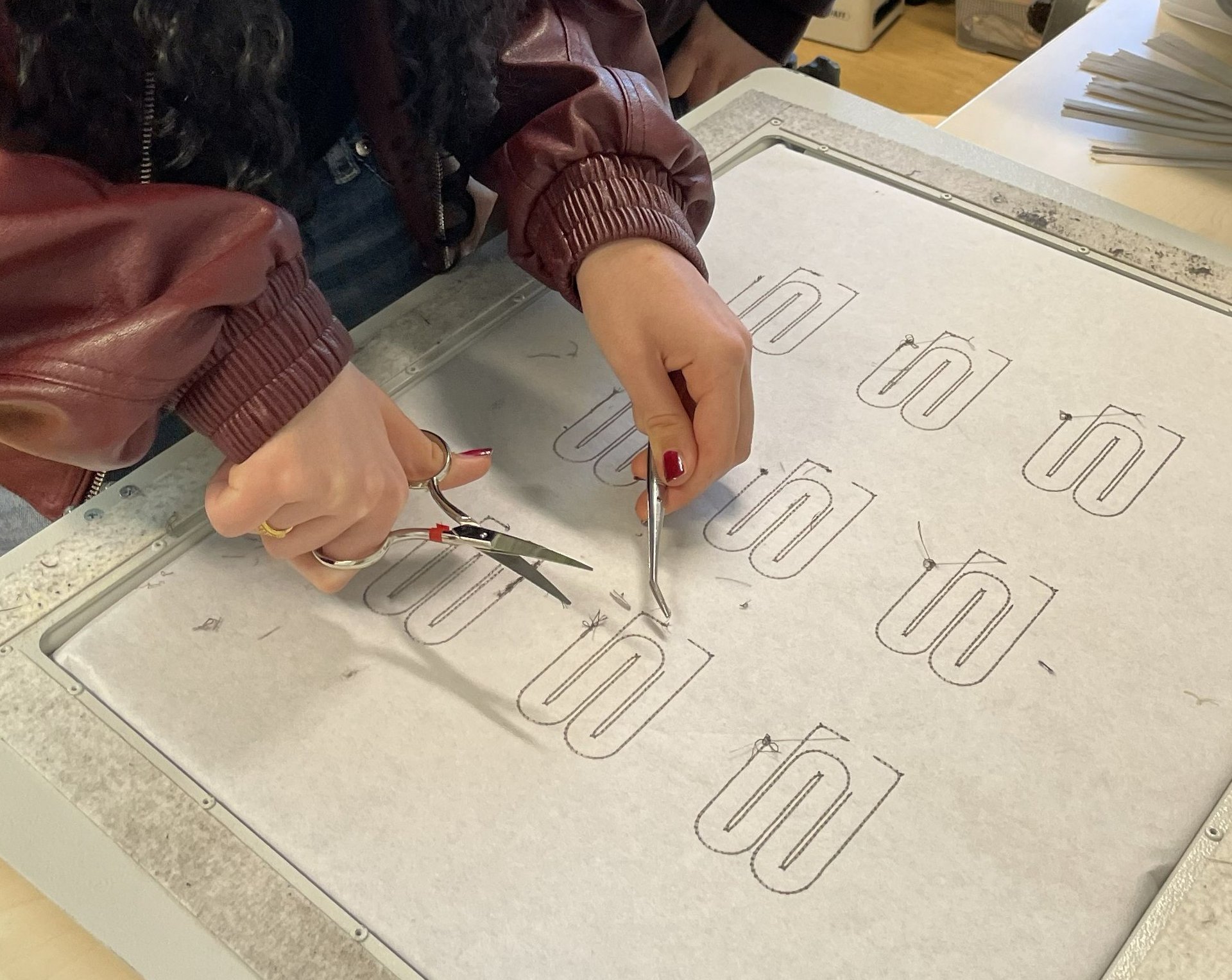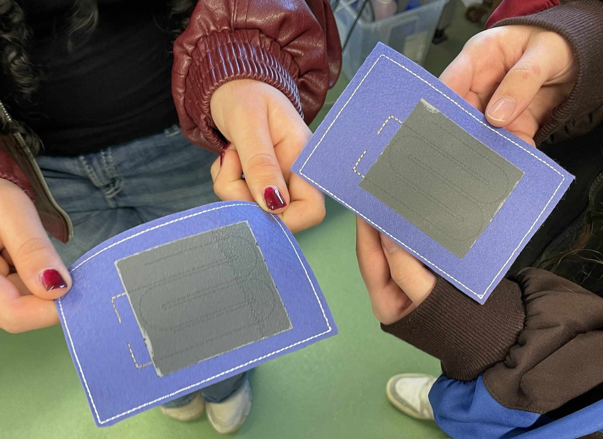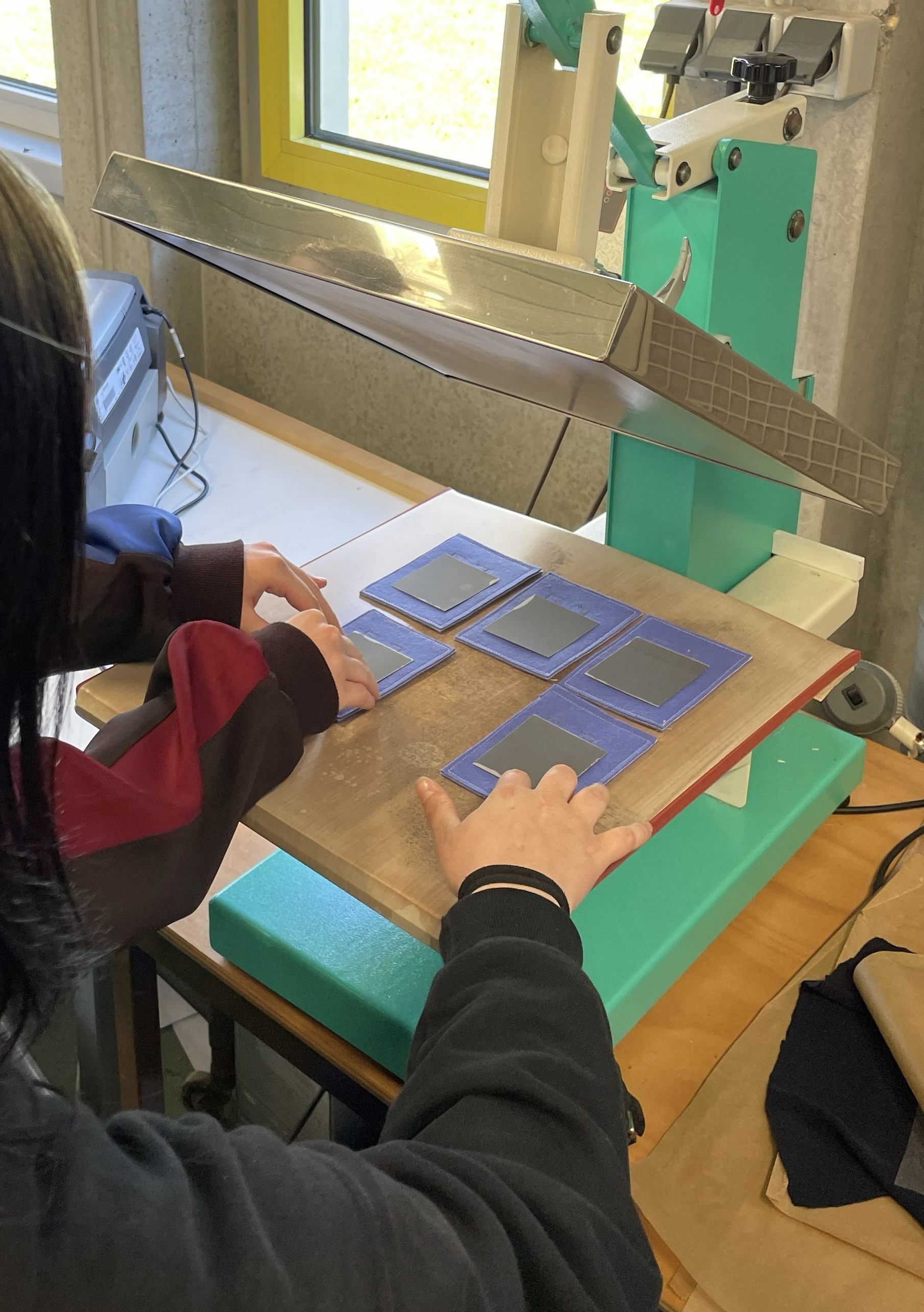 In den Laboren der TEXOVERSUM Fakultät Textil ging es ebenfalls interaktiv und kreativ zu: Ein eigenes Textil, das Wärme erzeugen kann, sollte hergestellt werden. Nach einem Blick in die Welt smarter und technischer Textilien, die in Funktionskleidung, Medizintechnik, Bau- und Werkstoffen Einsatz finden, wurden die fünf Zehntklässlerinnen selbst aktiv. Für ihr Heiztextil bedruckten sie zunächst ein spezielles leitfähiges Material, was sie nach dem Trocknen in Mustergröße zuschnitten. Im Sticklabor wurden für alle Muster Leiterbahnen mit leitfähigem Garn gestickt, die anschließen mit dem beschichteten Material im Thermotransferdruck verbunden wurden. Mit einer Batterie als Stromquelle konnten dann alle testen, ob und wie viel Wärme ihr Textil erzeugt – es hat bei allen funktioniert! Abgerundet wurde das Programm mit einer Führung durch die Textillabore und das TEXOVERSUM Gebäude.