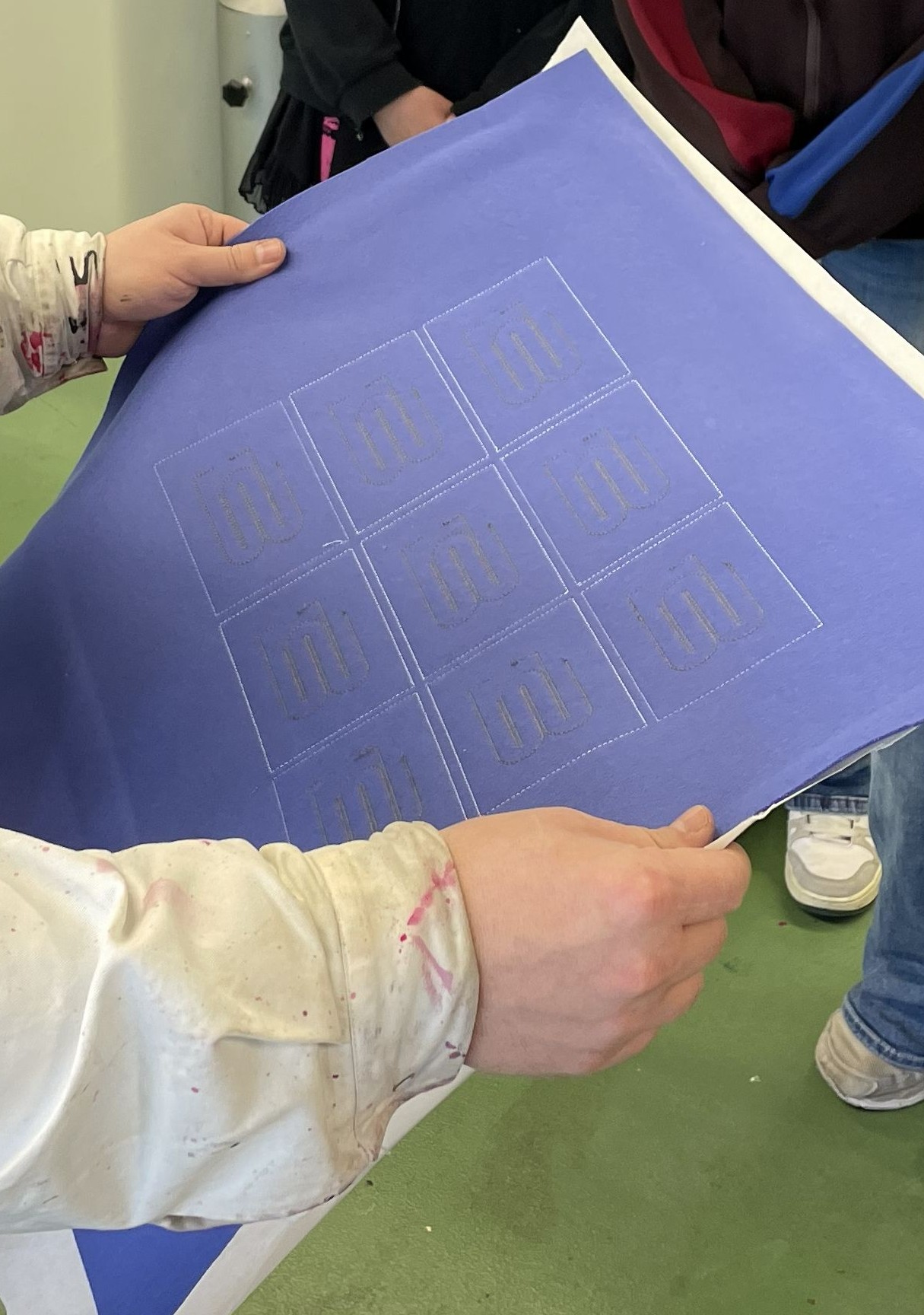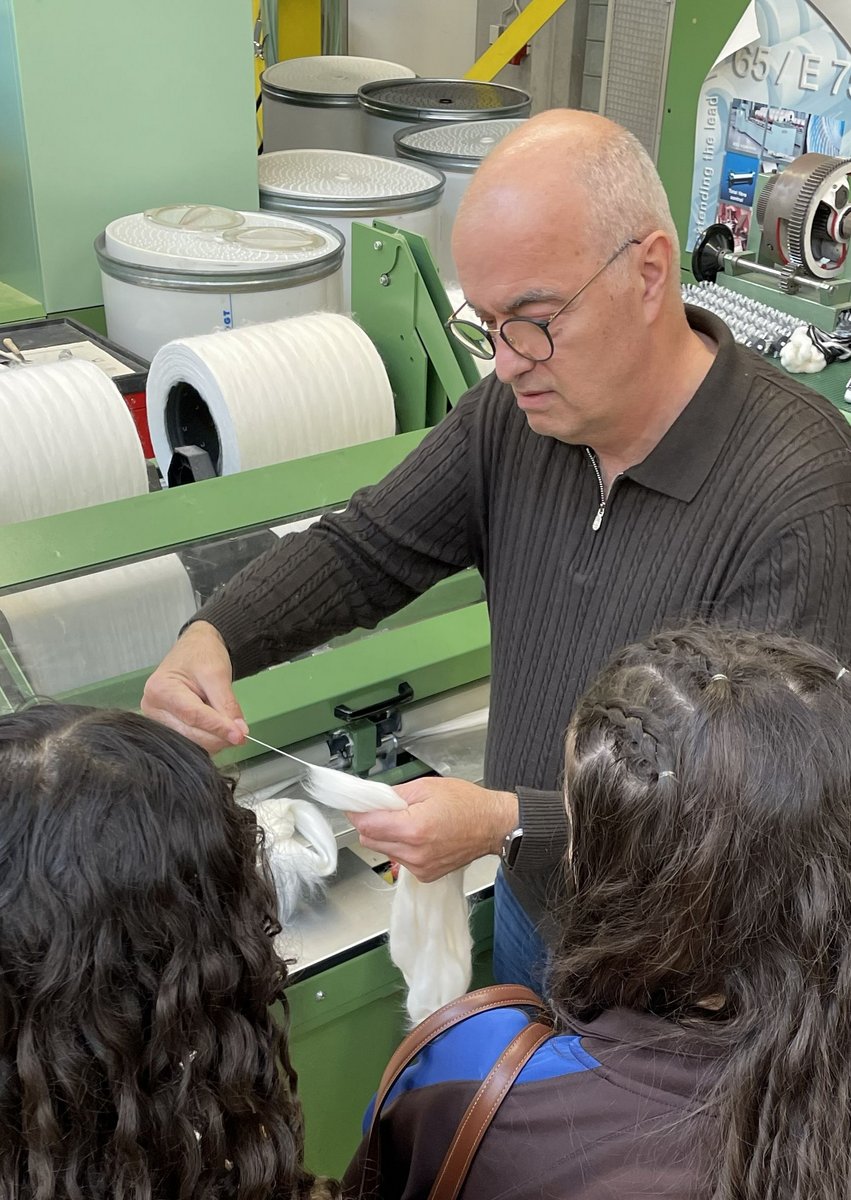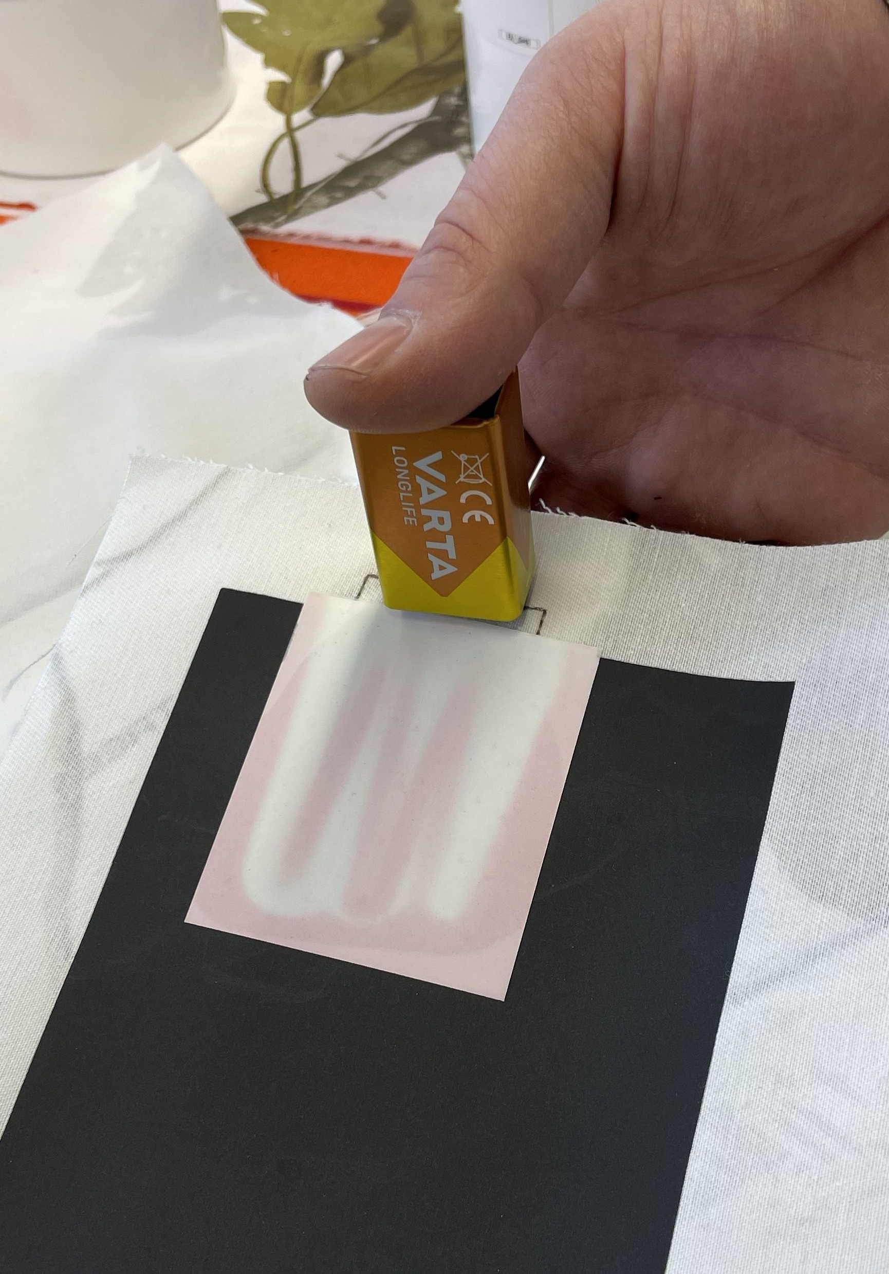 In den Laboren der TEXOVERSUM Fakultät Textil ging es ebenfalls interaktiv und kreativ zu: Ein eigenes Textil, das Wärme erzeugen kann, sollte hergestellt werden. Nach einem Blick in die Welt smarter und technischer Textilien, die in Funktionskleidung, Medizintechnik, Bau- und Werkstoffen Einsatz finden, wurden die fünf Zehntklässlerinnen selbst aktiv. Für ihr Heiztextil bedruckten sie zunächst ein spezielles leitfähiges Material, was sie nach dem Trocknen in Mustergröße zuschnitten. Im Sticklabor wurden für alle Muster Leiterbahnen mit leitfähigem Garn gestickt, die anschließen mit dem beschichteten Material im Thermotransferdruck verbunden wurden. Mit einer Batterie als Stromquelle konnten dann alle testen, ob und wie viel Wärme ihr Textil erzeugt – es hat bei allen funktioniert! Abgerundet wurde das Programm mit einer Führung durch die Textillabore und das TEXOVERSUM Gebäude.