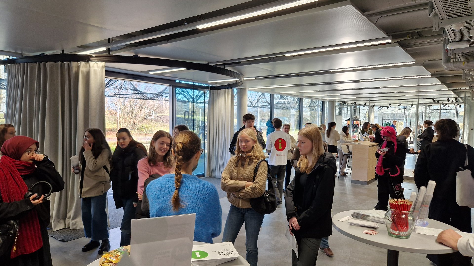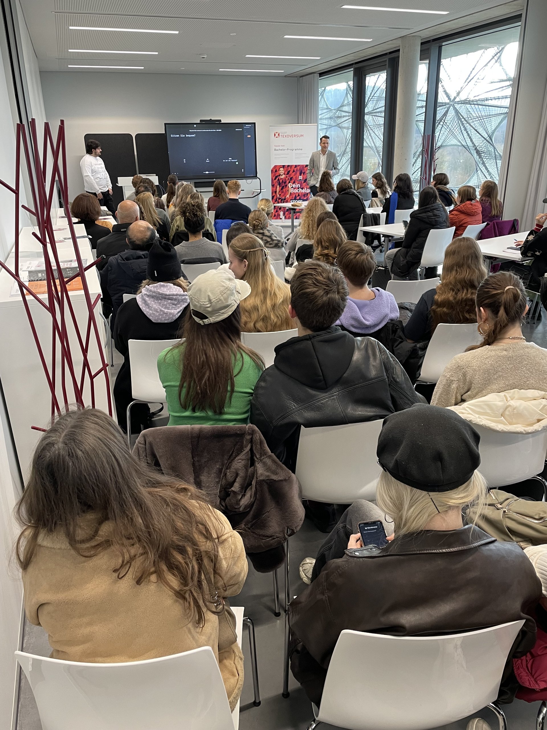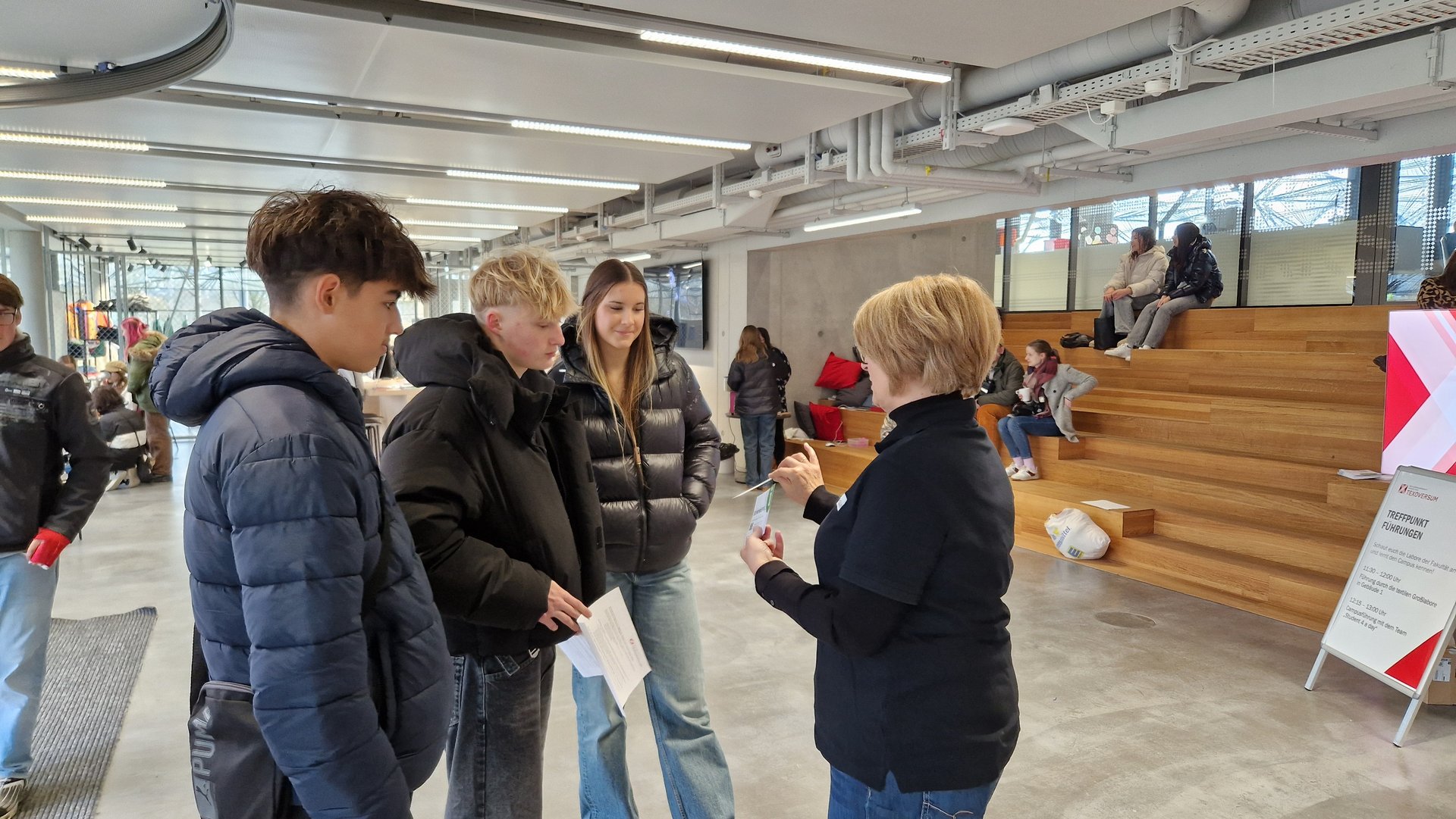 Im Foyer des Gebäudes standen Ansprechpersonen für persönliche Gespräche bereit. Aktuell Studierende berichteten aus erster Hand über ihren Studienalltag. Einige Schülerinnen und Schüler hatten bereits klare Vorstellungen über ihre Studienwahl und stellten konkrete Fragen zum Ablauf des Studiums. Andere nutzten den Tag für die persönliche Orientierung und um erste Eindrücke zu sammeln.