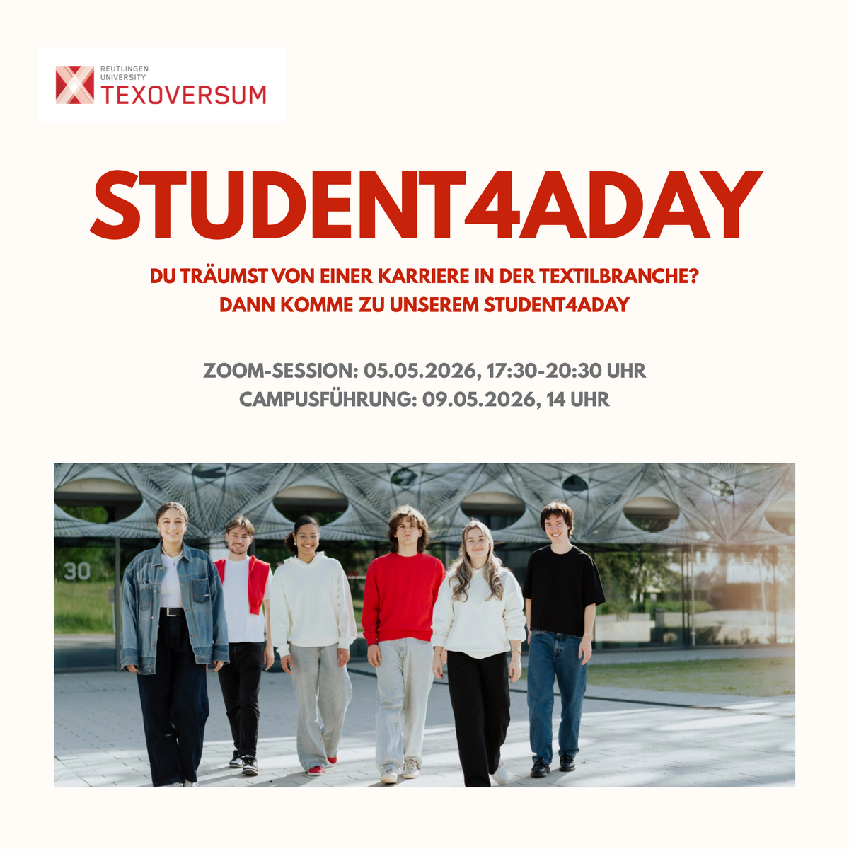 Dann werde mit Student4aDay für einen Tag Teil des TEXOVERSUM und erlebe, wie vielseitig ein Studium an der Fakultät Textil der Hochschule Reutlingen sein kann.